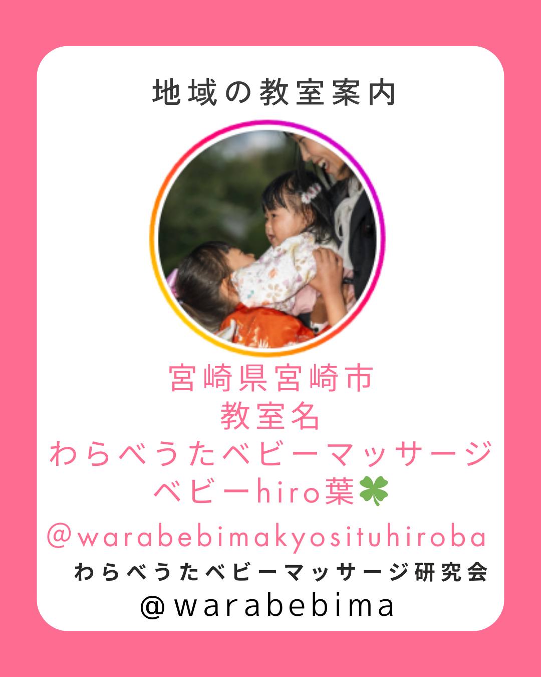 ■「わらべうたベビマ教室」紹介■#宮崎県宮崎市のお教室「#わらべうたベビーマッサージベビーhiro葉」さんです@warabebimakyosituhirobaぜひ、お近くの方はお越しください。#認定講師がお伝えするので安心です。★ベビマ認定講師募集中★資格を取得して、あなたもお教室を始めてみませんか?事前学習で、一日で資格が取得できます。詳細は、Instagramプロフィールリンク先よりお越しくださいフォローお願いします★ベビマ教室募集中★当会Instagramで紹介するお教室を募集中です詳細は、当会HPの認定者の部屋よりご確認ください。■掲載場所■「topページ「全国のわらべうたベビーマッサージ教室で紹介されます」 https://www.jyosansi.com/「Instagramでは @warabebima で紹介されます。」「わらべうたベビーマッサージFacebookにも紹介されます」#わらべうたベビーマッサージ #わらべうたベビーマッサージ教室 #教室紹介 #全国わらべうたベビマ教室 #ベビマ教室 @MomokaIiyama n_yoko supa67101 @minawarawa @kumikodktsk@CHERISHTOUCH24  @mama.imakara11 @fortune_happybaby  @cheerfull315 @wara_baby_teto  @warabebi_remon  @babyimonica @abikojosanin