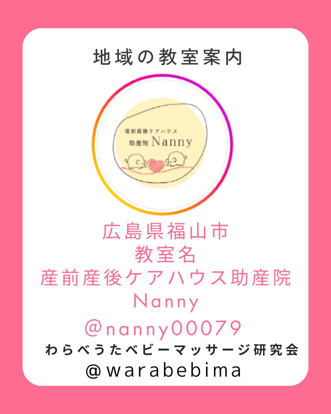■「わらべうたベビマ教室」紹介■#広島県福山市のお教室「#産前産後ケアハウス助産院Nanny)」さんです@nanny00079ぜひ、お近くの方はお越しください。#認定講師がお伝えするので安心です。★ベビマ認定講師募集中★資格を取得して、あなたもお教室を始めてみませんか?事前学習で、一日で資格が取得できます。詳細は、Instagramプロフィールリンク先よりお越しくださいフォローお願いします★ベビマ教室募集中★当会Instagramで紹介するお教室を募集中です詳細は、当会HPの認定者の部屋よりご確認ください。■掲載場所■「topページ「全国のわらべうたベビーマッサージ教室で紹介されます」 https://www.jyosansi.com/「Instagramでは @warabebima で紹介されます。」「わらべうたベビーマッサージFacebookにも紹介されます」#わらべうたベビーマッサージ #わらべうたベビーマッサージ教室 #教室紹介 #全国わらべうたベビマ教室 #ベビマ教室 @MomokaIiyama n_yoko supa67101 @minawarawa @kumikodktsk@babyimonica @rico_babym @hug.huwari @yumiebebima @warababyma_mattoyo @genkidscreator @ciel_arko @warababy_laulele @babysigns_chah_chan @himawarijyosanin @nomu_am