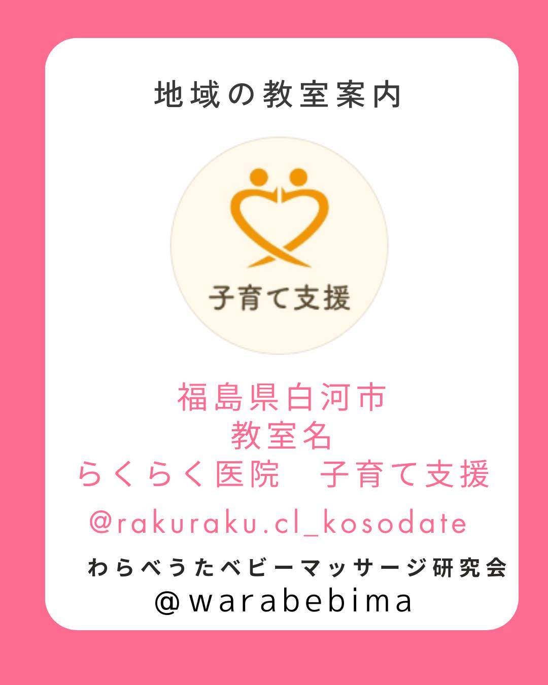 ■「わらべうたベビマ教室」紹介■#福島県白河市のお教室「#らくらく医院子育て支援」さんです@rakuraku.cl_kosodateぜひ、お近くの方はお越しください。#認定講師がお伝えするので安心です。★ベビマ認定講師募集中★資格を取得して、あなたもお教室を始めてみませんか?事前学習で、一日で資格が取得できます。詳細は、Instagramプロフィールリンク先よりお越しくださいフォローお願いします★ベビマ教室募集中★当会Instagramで紹介するお教室を募集中です詳細は、当会HPの認定者の部屋よりご確認ください。■掲載場所■「topページ「全国のわらべうたベビーマッサージ教室で紹介されます」 https://www.jyosansi.com/「Instagramでは @warabebima で紹介されます。」「わらべうたベビーマッサージFacebookにも紹介されます」#わらべうたベビーマッサージ #わらべうたベビーマッサージ教室 #教室紹介 #全国わらべうたベビマ教室 #ベビマ教室 @MomokaIiyaman_yokosupa67101@minawarawa@kumikodktsk@pure_baby_25 warababy @babyma_genkikko @pufflan101 @akane_sato_labo @tosichanclub @nanairo.rythmique @honomi_josanin @minawarawa @makia_egypt_kidssmile