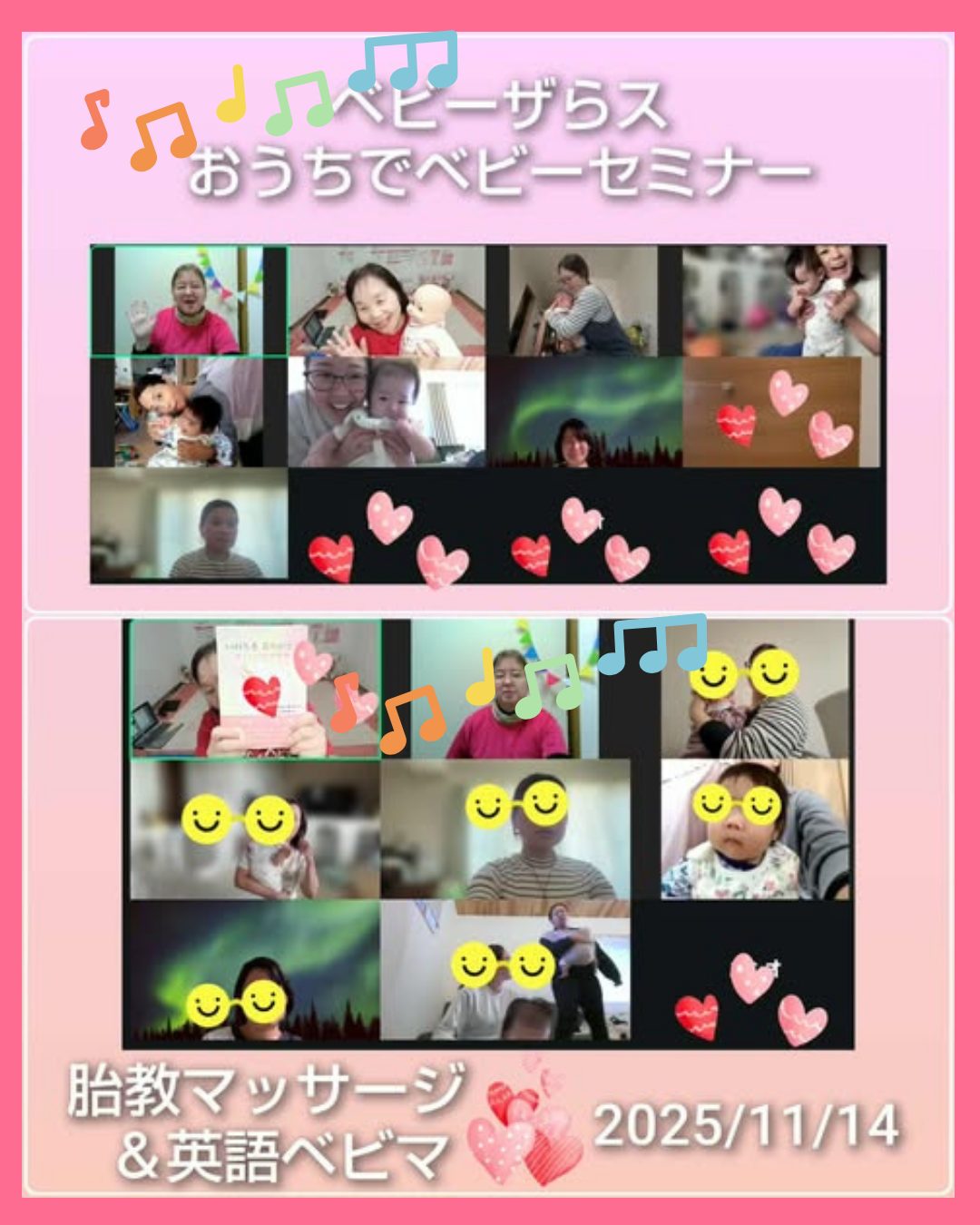 【ベビーザらス おうちでベビーセミナー 11/14】本日午前の部は、わらべうた胎教マッサージと英語ベビマでした。参加者14組。妊婦さんお2人いらっしゃいました。妊娠中に当セミナーを見つけて下さり良かったと思います!奥田先生が声かけをして、参加者のママや赤ちゃんの気持ちをアップさせてくれて、カメラオンにして下さったかたが沢山いました。皆さま御協力ありがとうございます♪パネルを使った説明のあと、妊娠中や産後に行うことが出来る手指のマッサージ、腰のマッサージを教えて下さいました♪英語ベビーマッサージでは、パネルを使用して、ママさんパパさんから赤ちゃんへ「いないいないばあ」をしていただきながら、「わらべうたベビーマッサージの良いところ」についてお伝えしました 皆さまは楽しみながら聞いて下さっていました!「あららハート」のお歌では、赤ちゃんも楽しめるようにペープサートを使いながら、手技をお伝えしました。その後、CDを流しながら一曲とおして皆さんご一緒に手技を行いました♫最初は緊張していたかたが多かったと思いますが、次第に、とてもリラックスした表情になっていきましたね♫ 活発に動いている赤ちゃんもいて、可愛かったです ママと赤ちゃんのニコニコ笑顔も見られました️体験会がキッカケとなり、わらべうたベビーマッサージに興味を持たれたかたが多いと思います。是非、ご近所に教室がないか探してみて下さい。全国に教室がありますし、オンライン教室もあります!!わらべうたベビーマッサージ研究会のSNSとして、LINE、YouTube、インスタグラムなどがあります♪ 友達追加やフォローしていただくと、お役立ち情報がゲットできますよ〜!!本日はご参加いただき、ありがとうございました♪担当 体験会講師シトウ#ベビーザらス #おうちでベビーセミナー #わらべうた #ベビーマッサージ #胎教
