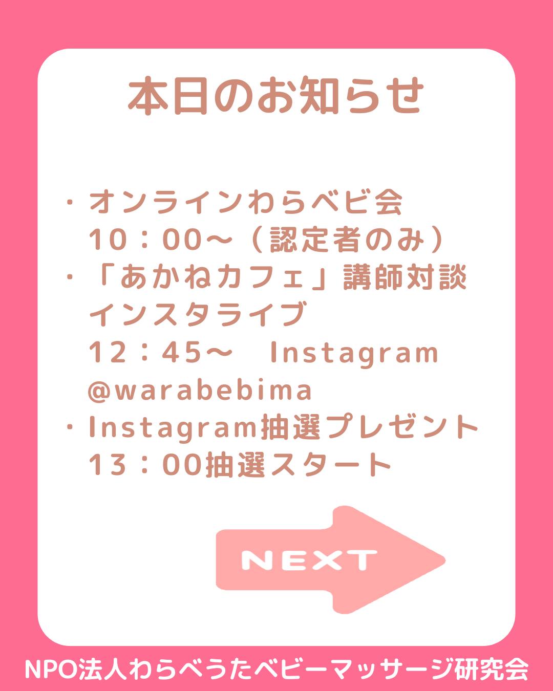 【本日のお知らせ】・10:00~わらベビ会(認定者のみ)・12:45~助産師のあかねカフェ 講師対談インスタライブ講師:永井知子先生Instagram @warabebima ライブ後抽選スタート【Instagram抽選プレゼント】★抽選期間:2月4日~2月27日★今月は、オリジナル音源ダウンロード版わらべうたベビーマッサージ書籍を限定2名様へプレゼント!★NPO法人わらべうたベビーマッサージ研究会のInstagram @warabebima をフォローしていただいた方の中から抽選プレゼント!【抽選ご希望の方】★@warabebimaをフォロー★Instagramのプロフィール画面の linktr.ee/warabebi をクリック!★リンク14.をクリック!★「Instagram抽選プレゼントお申込みフォーム」よりお申込みくださいご応募いただいた方の中から厳正なる抽選を行い当選者を決定いたします。当選発表は、プレゼントの発送をもって発表に代えさせていただきます。※プレゼント内容や当選人数、抽選期間は毎月変わります。抽選期間外のお申込みは無効となりますのでご注意ください。これからもわらベビ最新ニュースや耳より情報をどんどん発信していきますどうぞ、お楽しみに♪@warabebima @MomokaIiyama@minawarawa@kumikodktsk  @akemiokuda @chimugurisako#NPO法人わらべうたベビーマッサージ研究会#わらべうたベビーマッサージ#助産師が考案#Instagram抽選プレゼント#子育て#ベビーマッサージ #赤ちゃん #親子の絆作り #助産師#限定品 って魅力的!#日本传统婴幼儿按摩儿歌#请多多关照#非常感謝