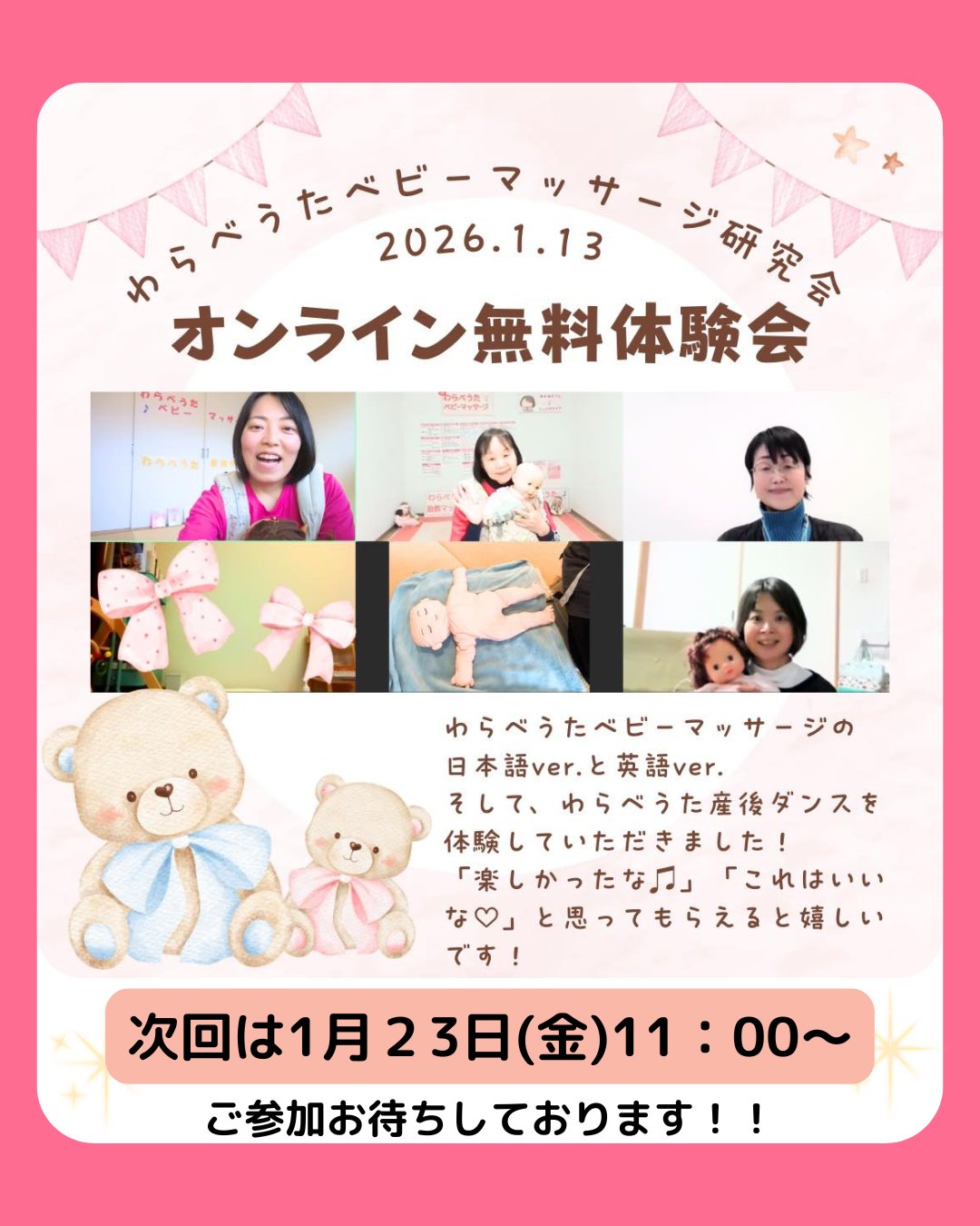 わらべうたベビーマッサージ&産後ダンス《オンライン無料体験会》2026年最初のオンライン体験会は6組の皆さんにご参加いただきました!わらべうたの手遊びの後は、わらべうたベビーマッサージ♡今回は座ったままできるキッズバージョンもご紹介しました。さらに、『あららハート』の英語バージョンは一緒に歌を歌ってみましたよ♫音源があるので英語が苦手だなぁ、、という方にもおすすめです♡後半の産後ダンスはしっかりと下半身を動かしてぽかぽかになりました!じんわり効いてくるダンス、ぜひ体験してみてください♫~~~~【オンライン無料体験会】は、子育て中の親子だけでなく、わらべうたベビーマッサージに興味のある方ならどなたでも参加できます!!保育士さんや助産師さん、子育て支援に関わる方、そして、わらべうたベビーマッサージ認定者の方などぜひ一度遊びに来てくださいお申し込みお待ちしております!《今後の予定》️1月23日(金)11:00〜わらべうた胎教マッサージ+わらべうたベビーマッサージ(キッズマッサージ)+脳活わらべうた️2月6日(金)11:00〜わらべうたベビーマッサージ(キッズマッサージ)+英語ベビーマッサージ+産後ダンス記:佐藤美奈#子育て #自宅でできる #赤ちゃん #無料体験会 #わらべうた #産後ダンス教室 @MomokaIiyama n_yoko supa67101 @minawarawa @kumikodktsk@babyimonica @rico_babym @hug.huwari @yumiebebima @warababyma_mattoyo @genkidscreator @ciel_arko @warababy_laulele @babysigns_chah_chan @himawarijyosanin @nomu_am