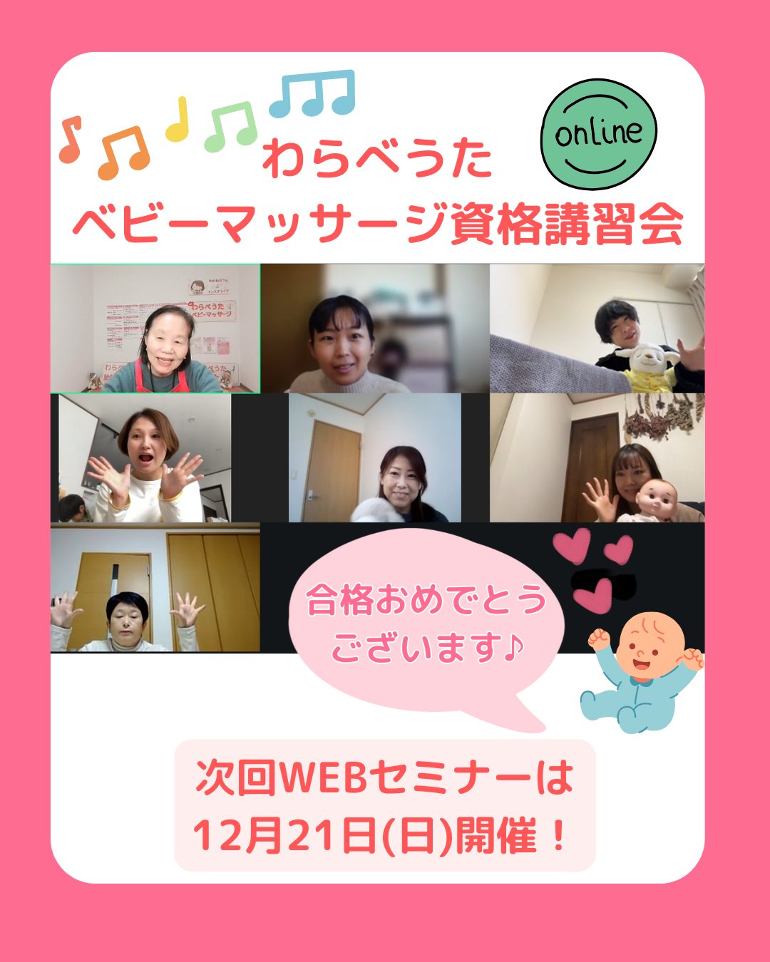 わらべうたベビーマッサージWEBセミナー本日、11月23日に開催させていただきました️「わらべうたベビーマッサージで、愛情をたっぷり注ぐあたたかい時間をたくさんの親子にひろめていきたい!」素敵な想いをお持ちのインストラクターが誕生いたしました🥰皆さま、合格おめでとうございます。全国各地にわらベビの笑顔の輪がひろがりますように楽しい子育てを応援しております!次回WEBセミナーは・・・12月21日(日) 9:30~16:30年内最後のオンラインです!そしてスキルアップに【アドバンスセラピスト養成講座】ファミリーセラピスト修了証が発行できる資格養成講座です。※合格された方は、遊びにおいでよ!プロジェクト講師としてもご活躍いただけます。12月16日(火) 9:30~13:30会場:オンラインお申込みは Instagramプロフィールlinktr.ee/warabebiをご覧ください。お申込み心よりお待ちしております@warabebima#わらべうたベビーマッサージ研究会#わらべうたベビーマッサージ#助産師が考案#資格取得#アドバンスセラピスト@warabebima@MomokaIiyaman_yokosupa67101@minawarawa@kumikodktsk @soramimi_hirao @mamano.koe @mee_no_kaachan @hotto_fuu @une.yuri97 @koara.hug @ehon.to.warabebima @hidamari.sasebo @babysigns_kiminote @lalababy2014