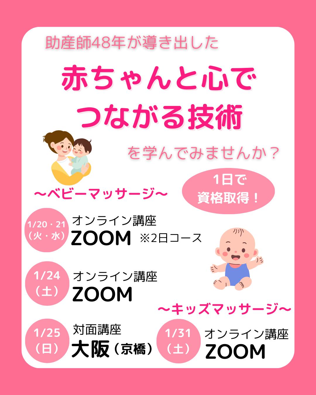 助産師が考案した安心のメソッド 【わらべうたベビーマッサージ 資格講座】 開催日一覧1月・1/20・21(2日コース)【WEB】ベビーマッサージ(9:30〜13:00)・1/24【WEB】ベビーマッサージ(9:30〜16:30)・1/25【大阪】ベビーマッサージ(9:30〜16:30)・1/31【WEB】キッズマッサージ(9:30〜16:30)2月・2/7【WEB】脳活わらべうた(9:30〜16:30)・2/14【WEB】産後ダンス(9:30〜16:30)・2/15【WEB】ベビーマッサージ(9:30〜16:30)・2/21【WEB】胎教マッサージ(9:30〜17:00)・2/22【東京】ベビーマッサージ(9:30〜16:30)・2/23【京都】ベビーマッサージ(9:30〜16:30)3月・3/16【WEB】キッズマッサージ(9:30〜16:30)・3/17【WEB】アドバンスセラピスト養成講座(9:30〜13:30)・3/20【広島】ベビーマッサージ(9:30〜16:30)・3/21【WEB】ベビーマッサージ(9:30〜16:30)・3/21【大阪】ベビーマッサージ(9:30〜16:30)・3/24・25(2日コース)【WEB】ベビーマッサージ(9:30〜13:00)\ 1日で資格取得! /対面でしっかり学べる講座です 育児に悩むあなたへ「なんで泣いてるの…?」「私のやり方、これでいいのかな…?」深夜、赤ちゃんを抱きしめながら涙がこぼれそうになる──そんな経験はありませんか。育児書どおりにはいかないし、ネットの情報は多すぎて、何を信じていいのか迷ってしまう。ひとりで抱え込み、孤独に感じてしまう日もありますよね。でも、大丈夫です。必要なのは難しい知識ではなく、“あなたの優しい声” と “温かい手” だけ。わらべうたを口ずさみながら触れると、赤ちゃんは安心して、手足をぱたぱた、にっこり笑顔に。その瞬間、不安がふっと軽くなり、「この子がいてくれるだけで幸せ」と思える時間が訪れます。 わらべうたベビーマッサージとは?わらべうたのリズムに合わせた、やさしいタッチケア。・赤ちゃんが安心してリラックス・親子の絆がぐっと深まる・発達を自然にサポートおじいちゃん・おばあちゃんにも好評で、お孫さんとのふれあい時間として取り入れる方も増えています🧓 こんな方におすすめ 助産師・看護師・保育士など赤ちゃんと関わるお仕事の方 子育てに取り入れたいママ・パパ 教室を始めたい方、活動を広げたい方 お申込みはプロフィールのリンクから赤ちゃんとの時間が、もっと温かく、もっと幸せに変わります#子育て #自宅でできる #赤ちゃん #親子の絆作り #わらべうた #産後ダンス教室 @MomokaIiyama n_yoko supa67101 @minawarawa @kumikodktsk@poccapoca88 @yori._.kaka @kosodateohen.humming @nobuko_takanuki、 @mo_tina.2023 @sawaya_mw @saron_soranone @gallerykobotoke @babyma.e @bebimadance.mahounote