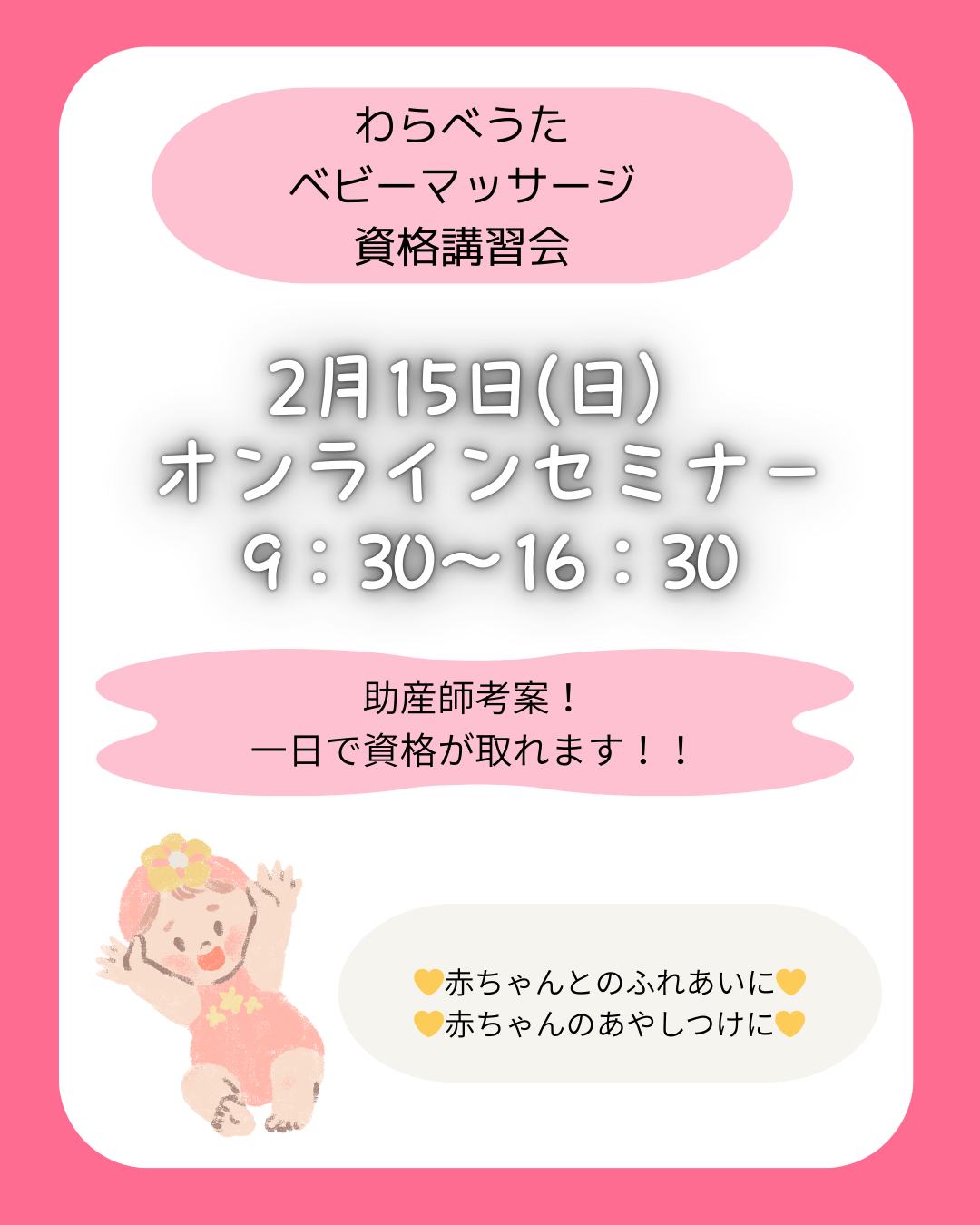 助産師が考案 【わらべうたベビーマッサージ 資格講座】 開催日:2026年2月15日(日) 時間:9:30〜16:30 オンラインセミナー(ご自宅から参加OK)\ 1日で資格取得!/自宅にいながら、しっかり学べる講座です※全国どこからでもご参加いただけますわらべうたに合わせて行うベビーマッサージは… 赤ちゃんが安心してリラックスできる 親子の絆を深める 発達をやさしくサポートさらに… 毎日の育児にそのまま取り入れられる こんな方におすすめ 助産師・保育士・看護師など赤ちゃんに関わるお仕事をしている方 自宅で育児に活かしたいママ・パパ おうち教室やサークルを始めたい方わらべうたベビーマッサージは、ママやパパだけでなく、おばあちゃん・おじいちゃんにも人気です🧓お孫さんとの おうちでのふれあい時間として楽しまれる方も増えていますお申込みはプロフィールのリンクから#子育て #自宅でできる #赤ちゃん #親子の絆作り #わらべうた @MomokaIiyama n_yoko supa67101 @minawarawa @kumikodktsk@babyimonica @rico_babym @hug.huwari @yumiebebima @warababyma_mattoyo @genkidscreator @ciel_arko @warababy_laulele @babysigns_chah_chan @himawarijyosanin @nomu_am