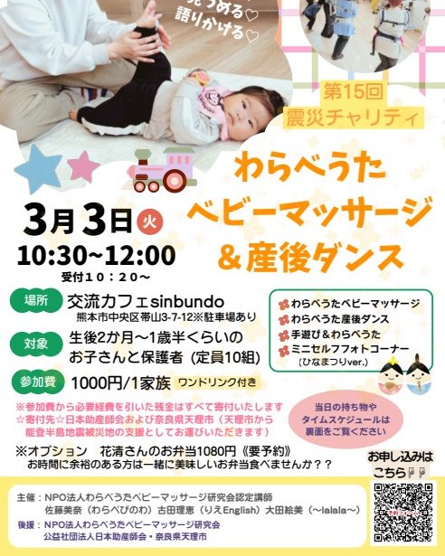 第15回震災チャリティ 熊本日程:2026年3月3日(火)時間:①10時30分~12時00分場所:交流カフェ「SINBUNDO」熊本市中央区帯山3-7-12※駐車場あり内容わらべうたベビーマッサージわらべうた産後ダンス手遊び&わらべうたミニセルフフォトコーナーぜひ遊びに来てくださいね#震災チャリティ熊本#わらべうたベビーマッサージ熊本#子育て わらべうたベビーマッサージ 2026.03.17
