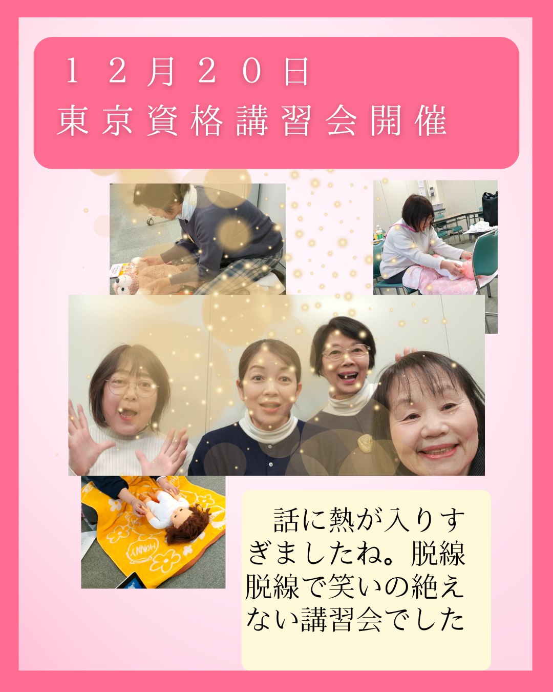 2025年12月20日 東京での資格講習会でした わらべうたベビーマッサージ資格講習会のご案内助産師考案「わらべうたベビーマッサージ」1日で資格取得!満足度90%・赤ちゃんが泣かずに楽しめる、わらべうたに合わせた優しいマッサージ。・親子の絆を深め、発達を促す内容で、育児にもお仕事にも役立ちます。こんな方におすすめ 赤ちゃんと関わるお仕事をしている方 子育てに活かしたいママ・パパ 教室やサークル活動を始めたい方