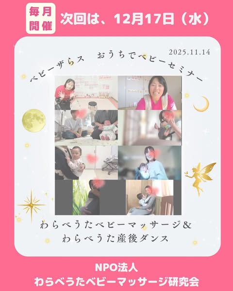 2025.11.14*******************ベビーザらスおうちでベビーセミナー*******************《午後の部》わらべうたベビーマッサージ&わらべうた産後ダンス本日は13組のご家族にご参加いただきました♡パパさんの姿もあり、家族みんかでわらべうたベビーマッサージを楽しんでくださる様子を嬉しく思いましたわらべうたあそびやいないいないばぁでは、かわいらしい笑顔がたくさん見られました。マッサージの時もお子さんの様子に合わせて、お座りや抱っこで上手に楽しんでおられました♬わらべうたベビーマッサージにはキッズバージョンもあるので動き出しても楽しめますよわらべうた産後ダンスでは、使う筋肉を意識するとより効果的ですじわじわとインナーマッスルを鍛えましょう♡「あららハート」は体力アップにぴったり!!ちょっと息が上がりますが、体の中からぽかぽかになれますよぜひおうちでも続けてみてくださいね︎わらべうたベビーマッサージの「あららハート」はYouTube動画もありますので、ぜひご覧ください♬ご参加ありがとうございました!!次回は、12月17日です♡担当 佐藤美奈#ベビーザらス #わらべうた #わらべうた産後ダンス @tonarino_hoikushi宮城県仙台市/栗原市 @musubi_josan_in大阪府箕面市 @sakura._sss石川県 @himawari_bebima福岡県久留米市 @hinata_maternity_hospital愛知県愛西市 @warabe_baby_genkikko兵庫県明石市 @hanauta.tesigoto千葉県千葉市 feathermoon.yoga大分県大分市 @ikuji.tsujiharumi神奈川県横浜市