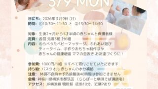 わらべうたベビーマッサージ 第15回震災チャリティを神奈川県で開催します! 御礼 ありがとうございます東日本大震災の翌年から続く大切なチャリティイベント。今年も親子でやさしい時間を過ごしながら、支援につなげます。参加費はすべて被災地の医療支援として寄付いたします🤍 日時2026年3月9日(月)①10:30〜11:50 定員3組 ②13:30〜14:50 定員3組 場所LaLa Baby(横浜市都筑区・鴨居駅徒歩約10分) 内容・わらべうたベビーマッサージ・親子のふれあい遊び・ティータイム・手作りおもちゃ制作🧸 対象生後2ヶ月〜1歳半頃までの赤ちゃんと保護者 参加費1,000円(全額寄付させていただきます) 持ち物バスタオル1枚だけでOK お申し込み専用の チャリティ予約フォーム からお願いします@lalababy2014 に掲載ストーリーズ チャリティ参照親子でゆったり過ごしながら、ママのリフレッシュ、お友だち作りや支援の輪を広げましょう。皆さまのご参加を心よりお待ちしています#横浜#震災チャリティ#わらべうたベビーマッサージ#子育てママ@lalababy2014@MomokaIiyama @minawarawa @kumikodktsk @warabebima @akemiokuda